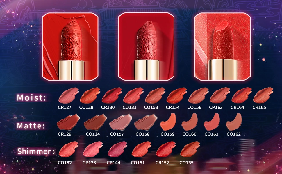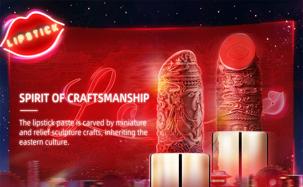 Det ytre etuiet til denne leppestiften er inspirert av kinesiske tradisjonelle malerier, som har arvet den østlige kulturen. Den ytre delen av denne leppestiften er inspirert av kinesiske tradisjonelle malerier, som arver den østlige kulturen. Og leppestiftpastaen er skåret ut av miniatyr- og relieffskulpturhåndverk og for å fremme estetikken til den kinesiske immaterielle kulturarven til verden. - 【Beste gavevalg】